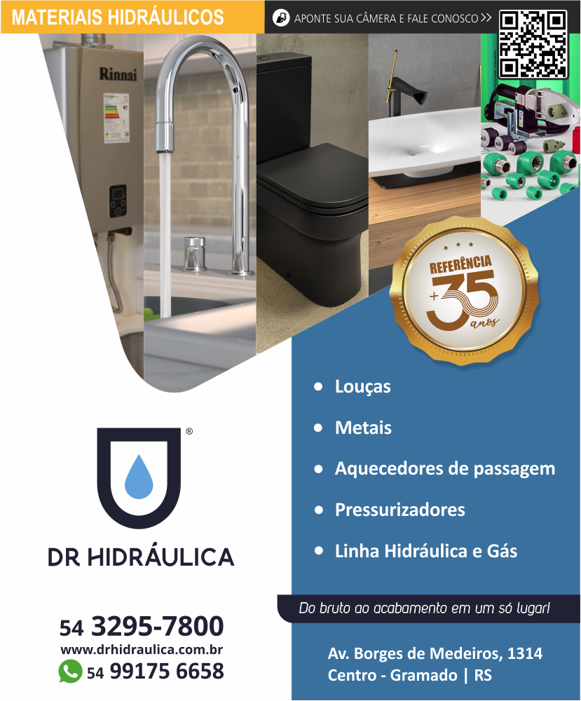 DR Hidráulica -Hidráulica- Matriz Av. Borges de Medeiros, 1314 Centro – Gramado – RS Telefone: +55 54 3295 7800 Filial Av. Borges de Medeiros, 3738 Shopping da Construção Gramado Telefone: +55 54 3286 7837 www.drhidraulica.com.br